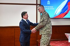 Губернатор напомнил, что в России отмечается день военного разведчика. Среди награжденных — старший разведчик Константин, которому вручена медаль «За отвагу».